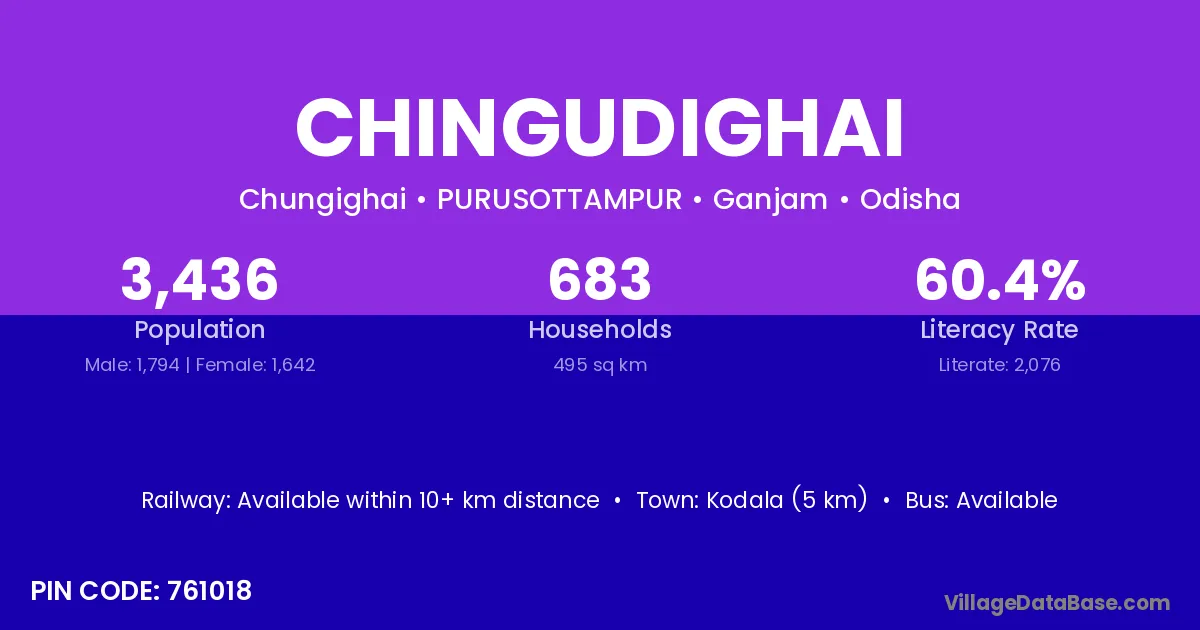 Kodala (5 km) is the nearest town to Chingudighai village for major economic activities and is located approximately 5 km away.