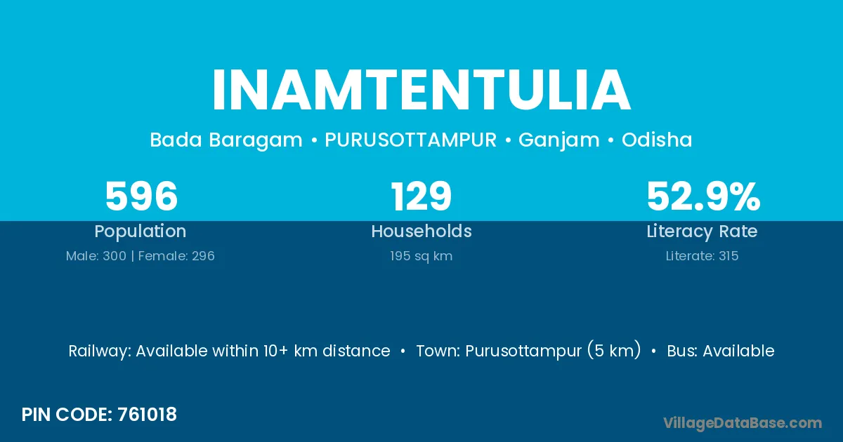 Purusottampur (5 km) is the nearest town to Inamtentulia village for major economic activities and is located approximately 5 km away.