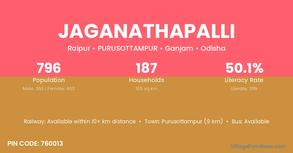 Purusottampur (9 km) is the nearest town to Jaganathapalli village for major economic activities and is located approximately 9 km away.