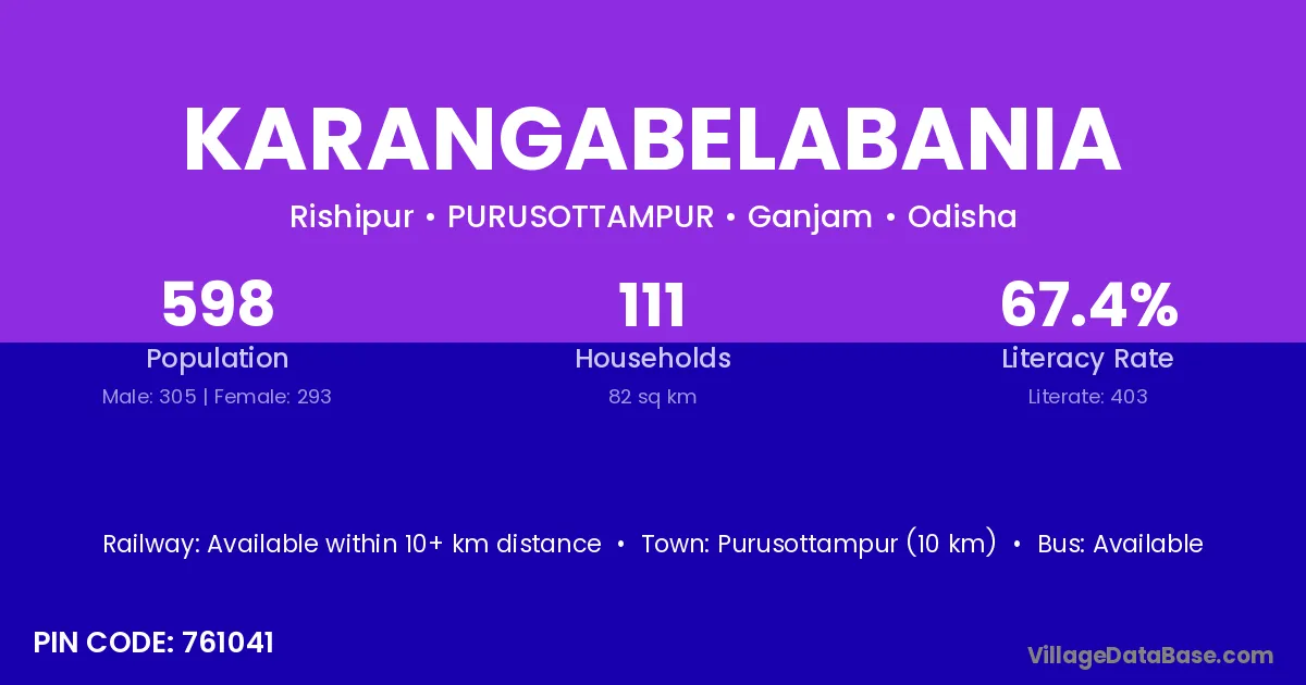 Purusottampur (10 km) is the nearest town to Karangabelabania village for major economic activities and is located approximately 10 km away.
