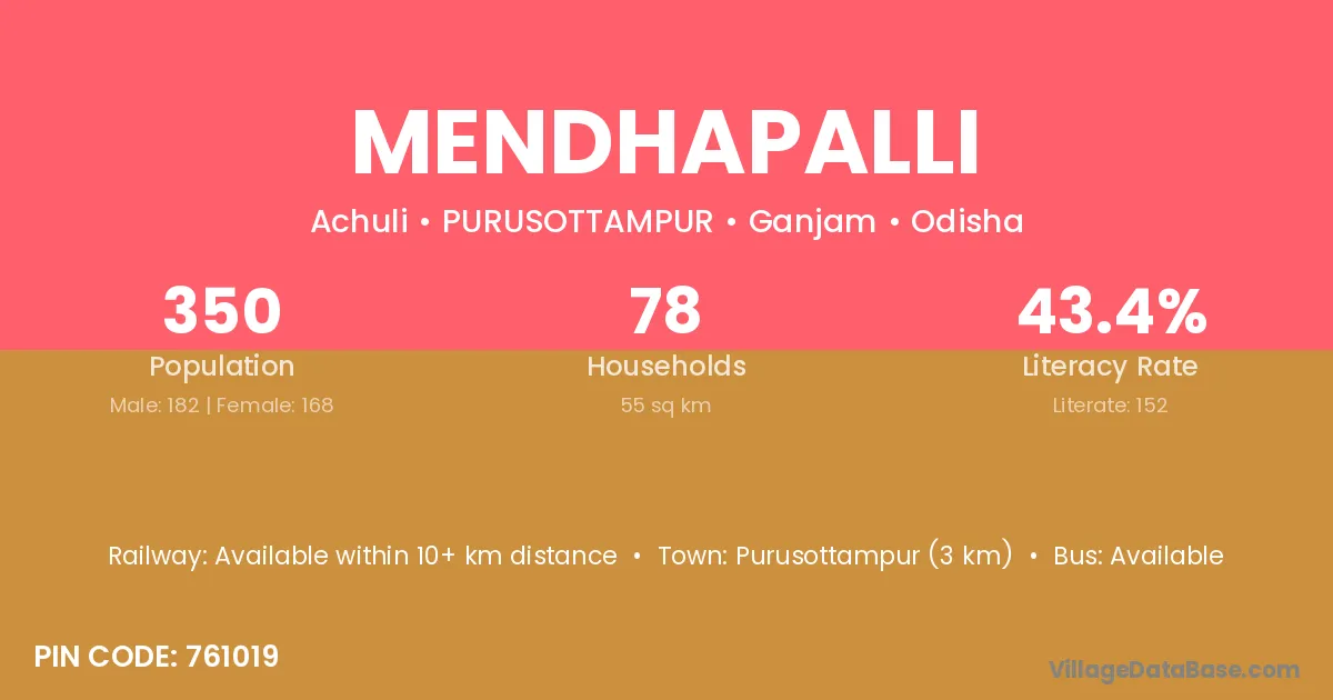 Purusottampur (3 km) is the nearest town to Mendhapalli village for major economic activities and is located approximately 3 km away.
