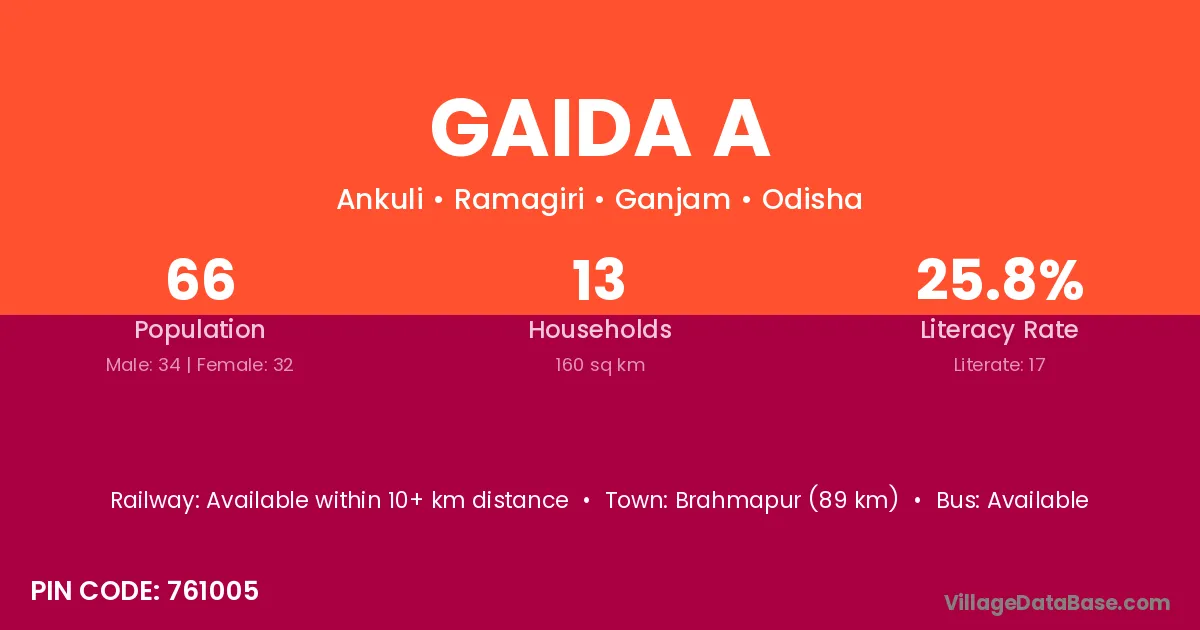Brahmapur (89 km) is the nearest town to Gaida A village for major economic activities and is located approximately 89 km away.