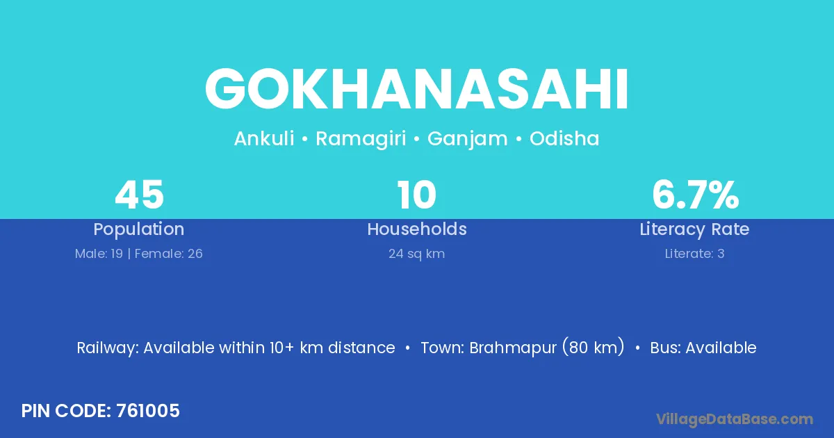 Gokhanasahi village has a total population of 45 people, of which 19 are males and 26 are females.