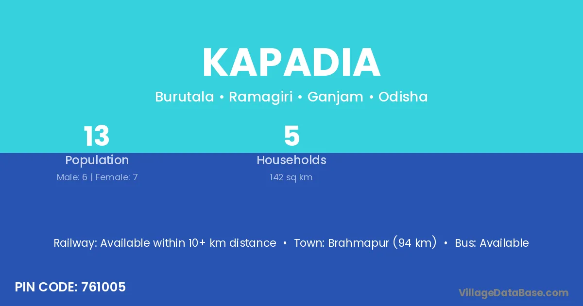 Brahmapur (94 km) is the nearest town to Kapadia village for major economic activities and is located approximately 94 km away.