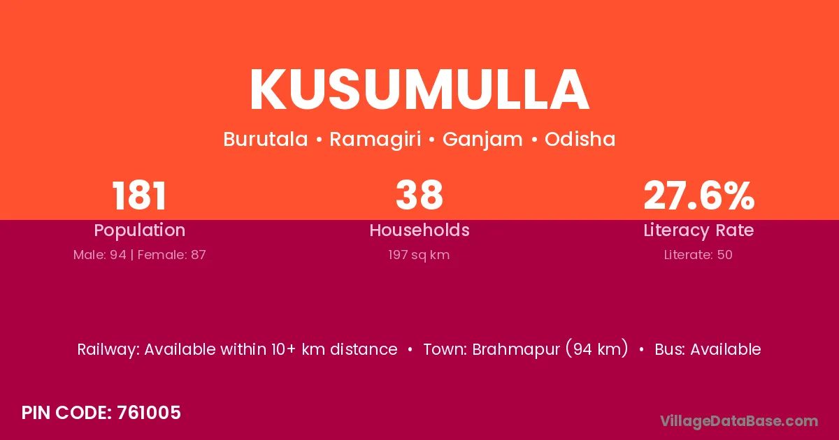 Kusumulla village has a total population of 181 people, of which 94 are males and 87 are females.