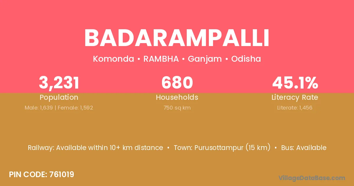 Purusottampur (15 km) is the nearest town to Badarampalli village for major economic activities and is located approximately 15 km away.