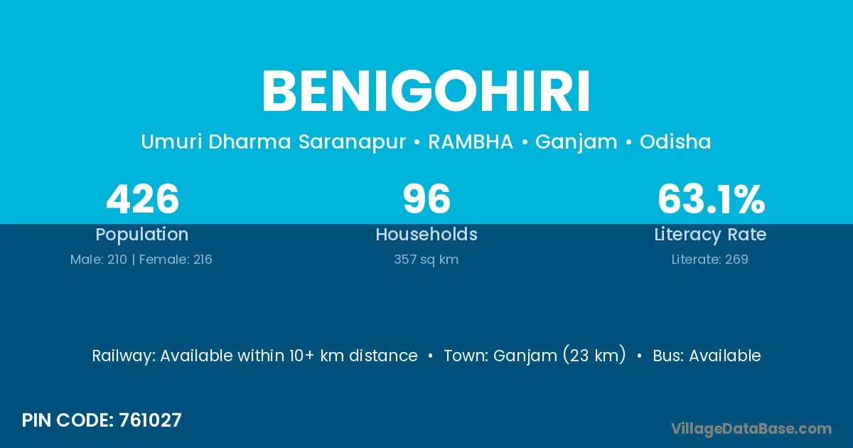Ganjam (23 km) is the nearest town to Benigohiri village for major economic activities and is located approximately 23 km away.