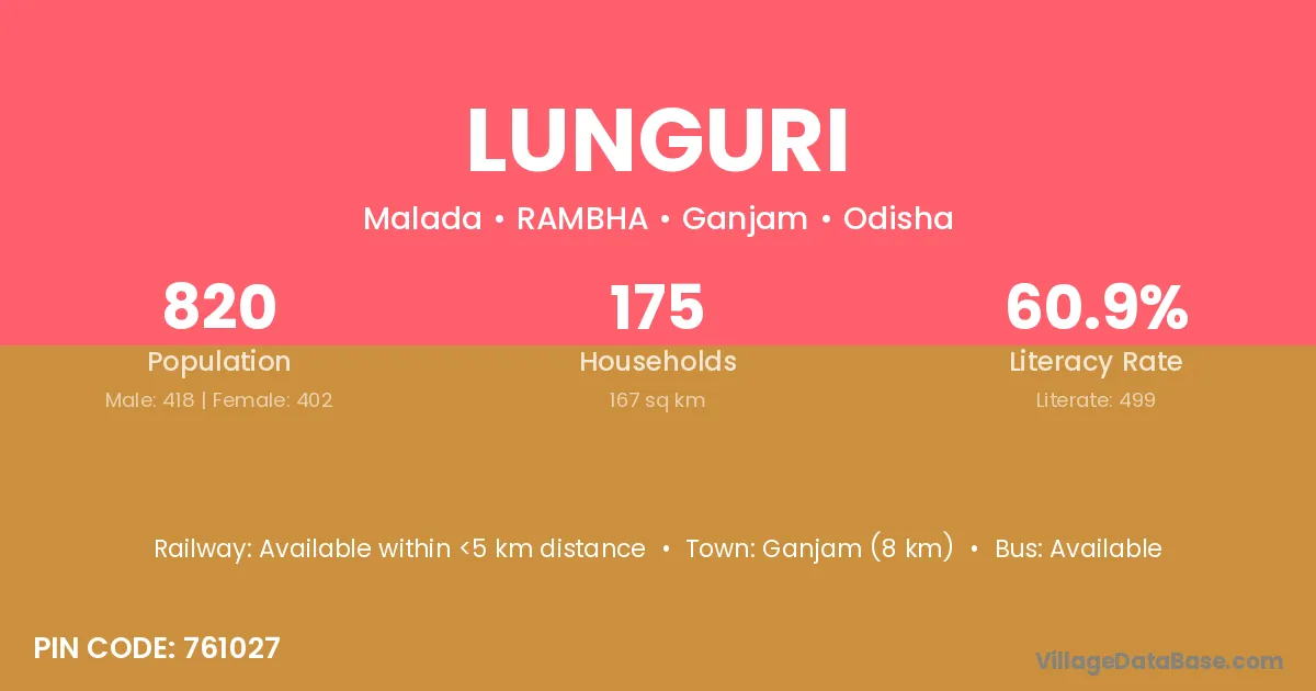 Ganjam (8 km) is the nearest town to Lunguri village for major economic activities and is located approximately 8 km away.