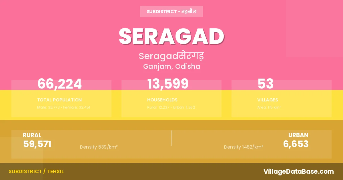 According to the 2011 census The total area of SERAGAD Tehsil is 115 km², with a population of 66224 people. The population density is 576 inhabitants per square kilometre, and there are approximately 13599 houses in the sub district.