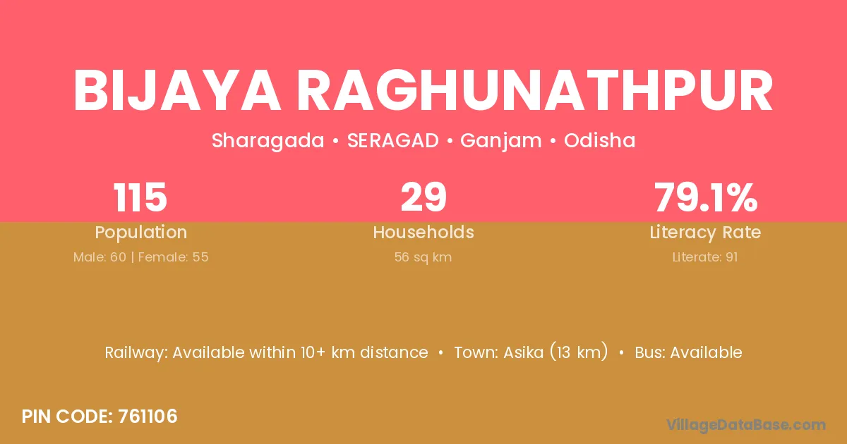 Asika (13 km) is the nearest town to Bijaya Raghunathpur village for major economic activities and is located approximately 13 km away.