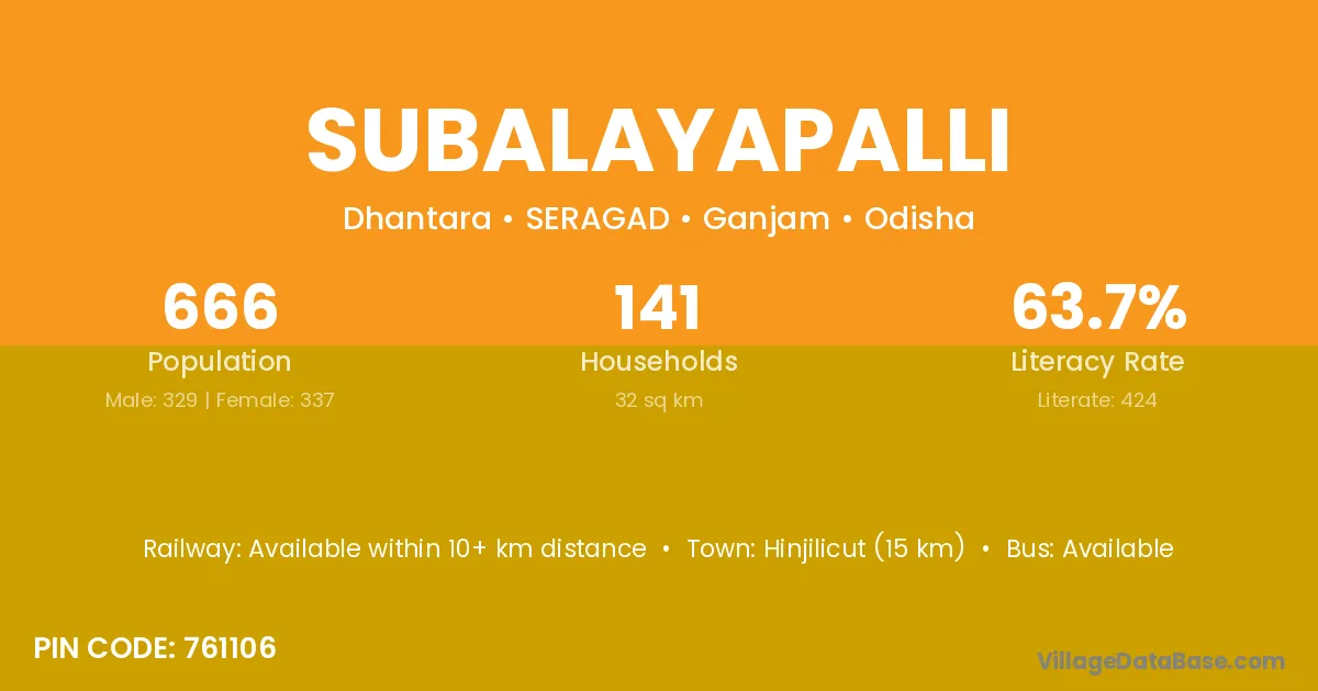 Hinjilicut (15 km) is the nearest town to Subalayapalli village for major economic activities and is located approximately 15 km away.