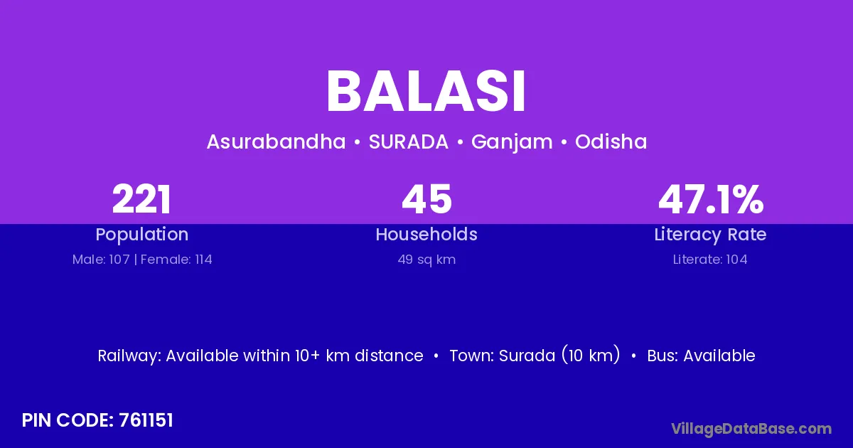 Balasi village has a total population of 221 people, of which 107 are males and 114 are females.