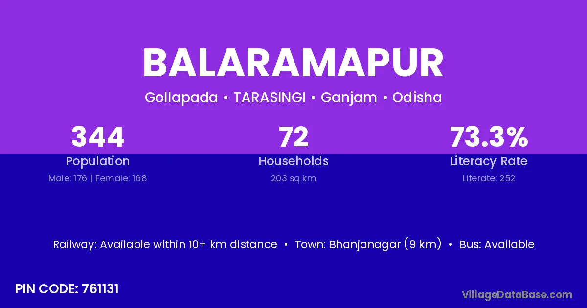 Balaramapur village has a total population of 344 people, of which 176 are males and 168 are females.