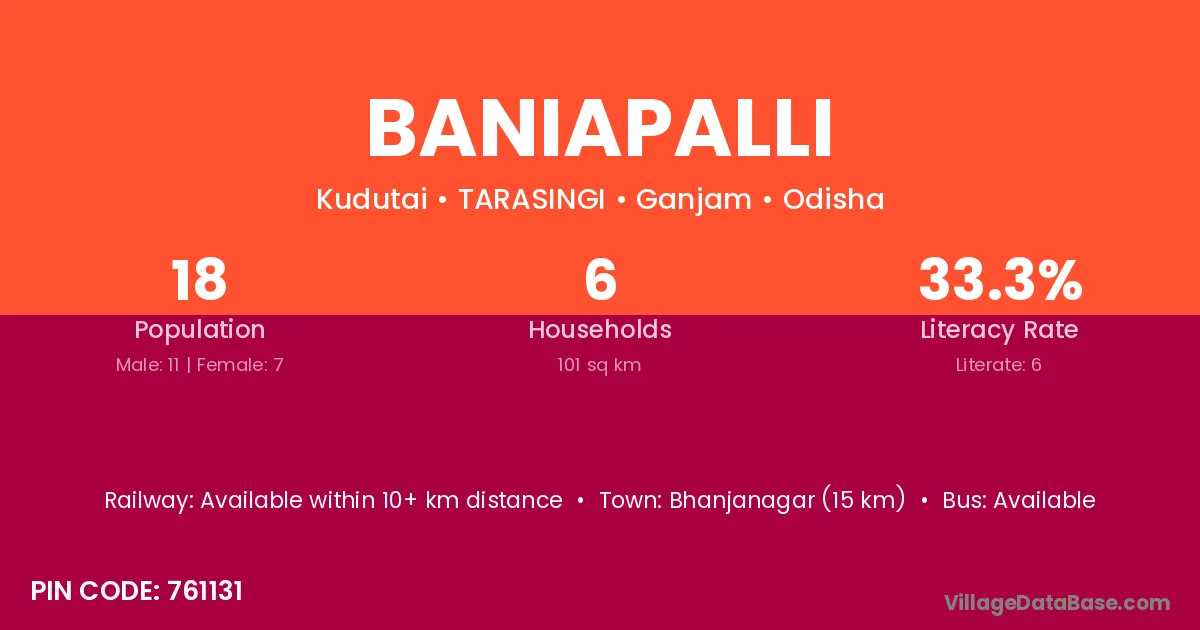Baniapalli village has a total population of 18 people, of which 11 are males and 7 are females.