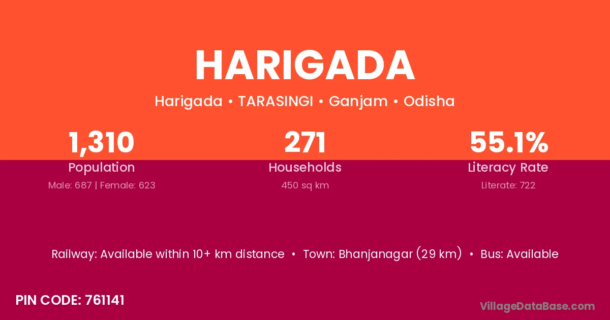 Bhanjanagar (29 km) is the nearest town to Harigada village for major economic activities and is located approximately 29 km away.