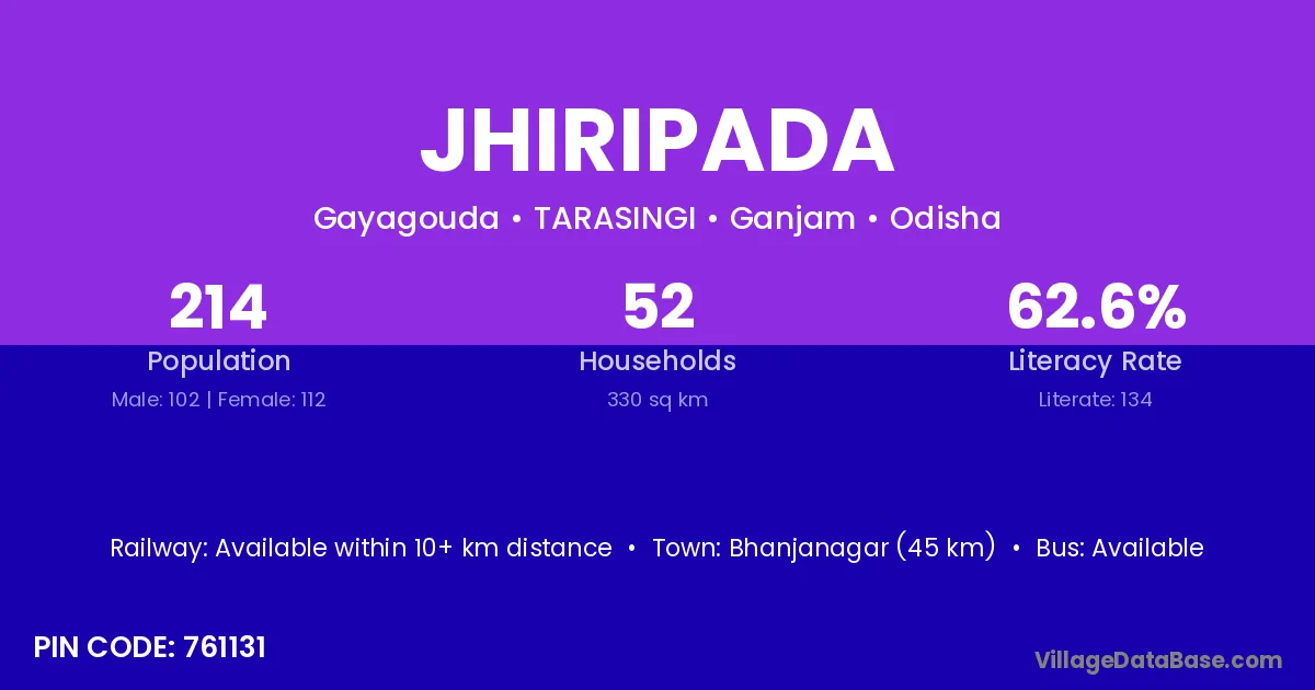 Bhanjanagar (45 km) is the nearest town to Jhiripada village for major economic activities and is located approximately 45 km away.