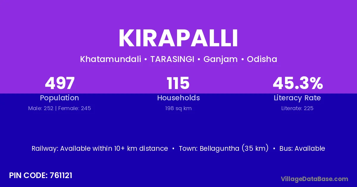 According to Census 2011 information, the village code of Kirapalli village is 761121.