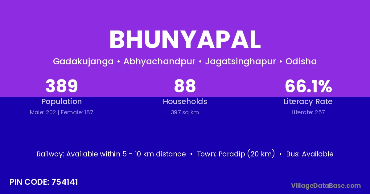 Paradip (20 km) is the nearest town to Bhunyapal village for major economic activities and is located approximately 20 km away.