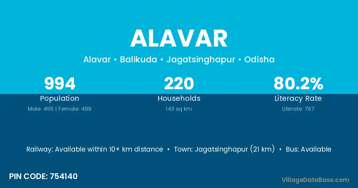 Jagatsinghapur (21 km) is the nearest town to Alavar village for major economic activities and is located approximately 21 km away.