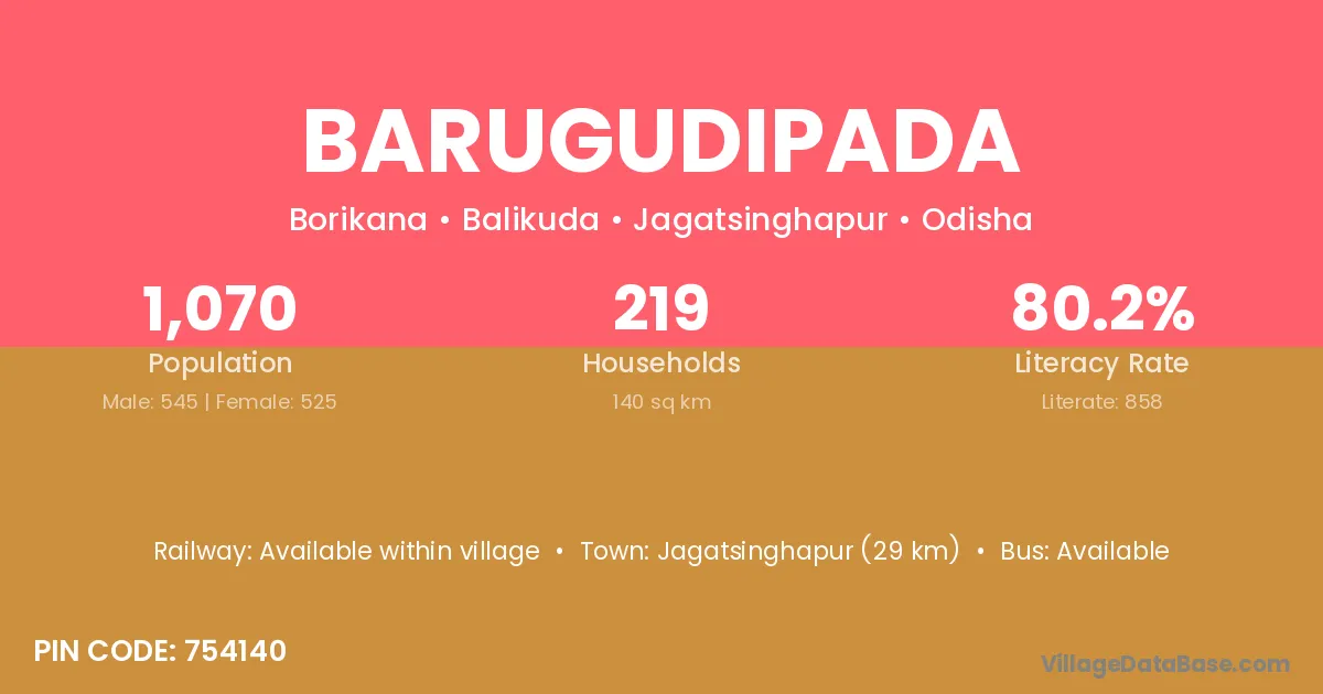 Jagatsinghapur (29 km) is the nearest town to Barugudipada village for major economic activities and is located approximately 29 km away.