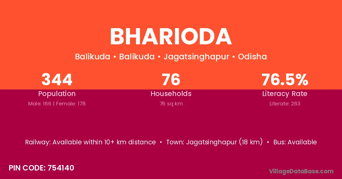 Jagatsinghapur (18 km) is the nearest town to Bharioda village for major economic activities and is located approximately 18 km away.