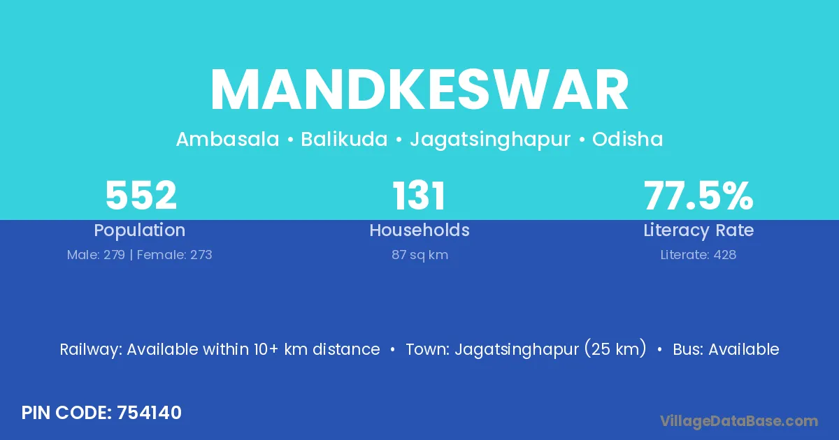 Jagatsinghapur (25 km) is the nearest town to Mandkeswar village for major economic activities and is located approximately 25 km away.