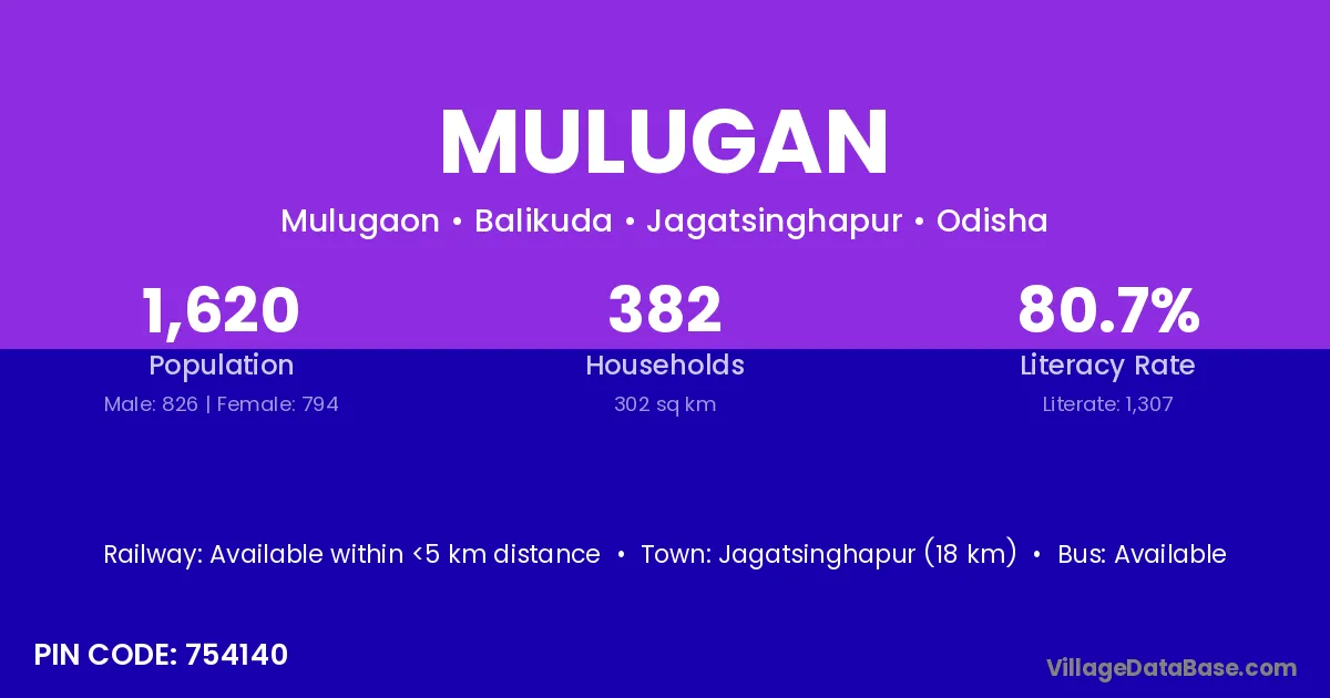 Jagatsinghapur (18 km) is the nearest town to Mulugan village for major economic activities and is located approximately 18 km away.