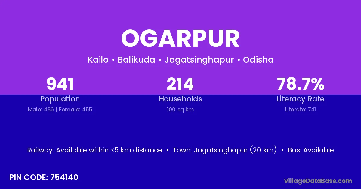 Jagatsinghapur (20 km) is the nearest town to Ogarpur village for major economic activities and is located approximately 20 km away.