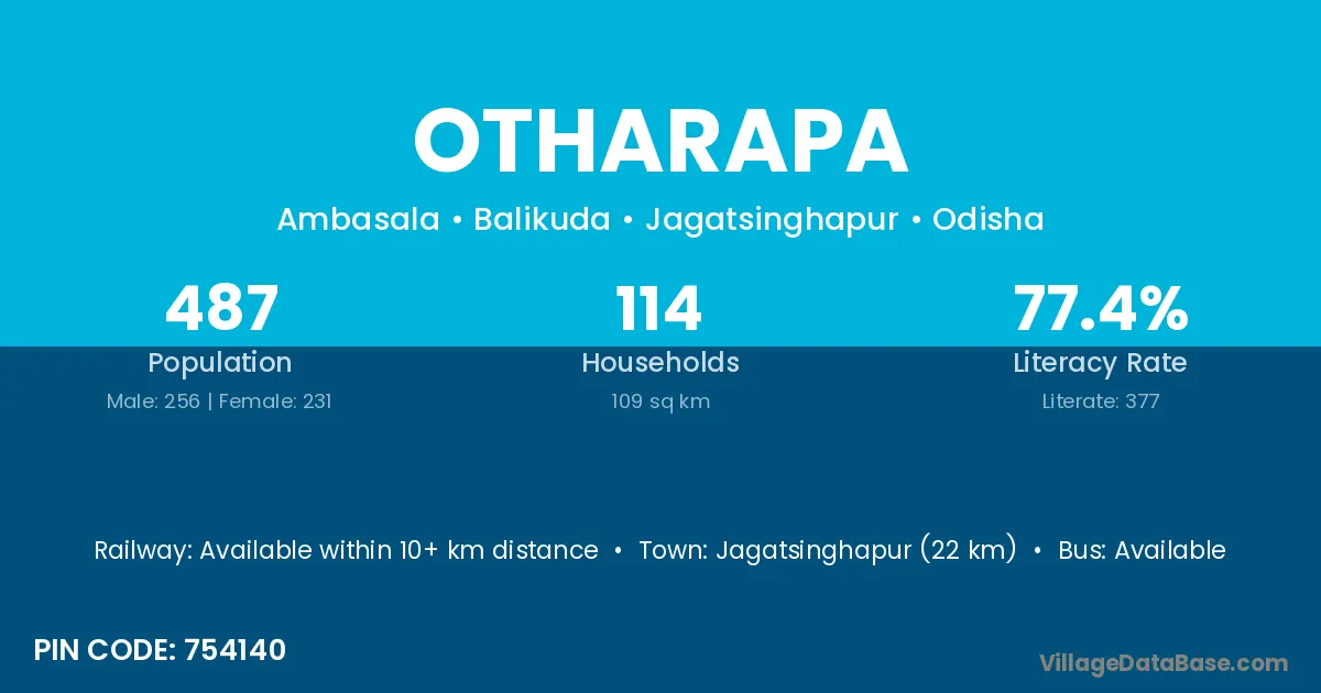 Jagatsinghapur (22 km) is the nearest town to Otharapa village for major economic activities and is located approximately 22 km away.