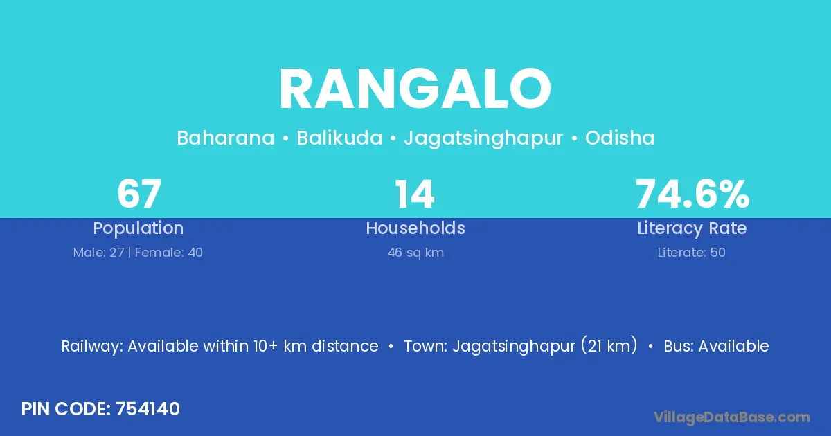 Jagatsinghapur (21 km) is the nearest town to Rangalo village for major economic activities and is located approximately 21 km away.