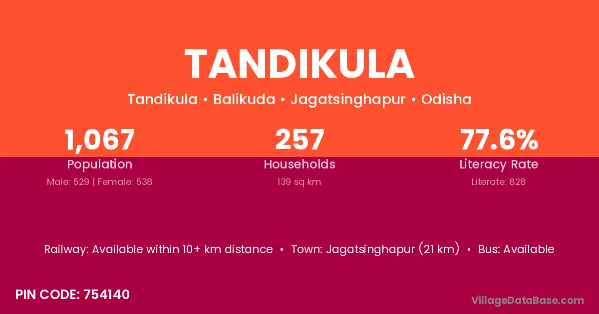 Jagatsinghapur (21 km) is the nearest town to Tandikula village for major economic activities and is located approximately 21 km away.