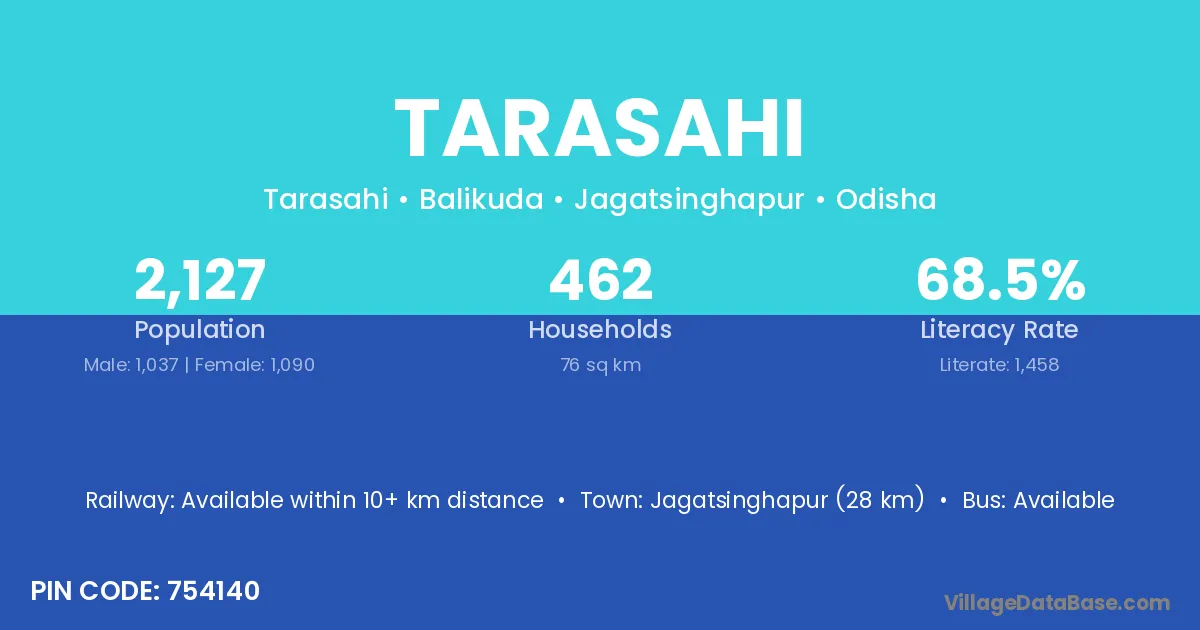 Jagatsinghapur (28 km) is the nearest town to Tarasahi village for major economic activities and is located approximately 28 km away.
