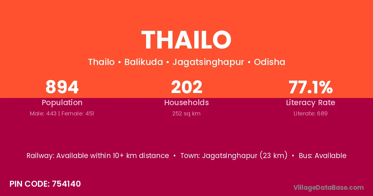 Jagatsinghapur (23 km) is the nearest town to Thailo village for major economic activities and is located approximately 23 km away.