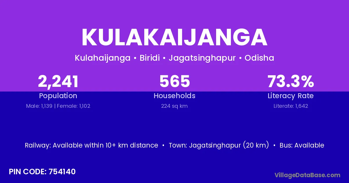 Jagatsinghapur (20 km) is the nearest town to Kulakaijanga village for major economic activities and is located approximately 20 km away.