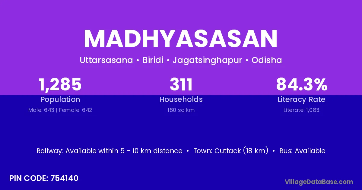 Cuttack (18 km) is the nearest town to Madhyasasan village for major economic activities and is located approximately 18 km away.