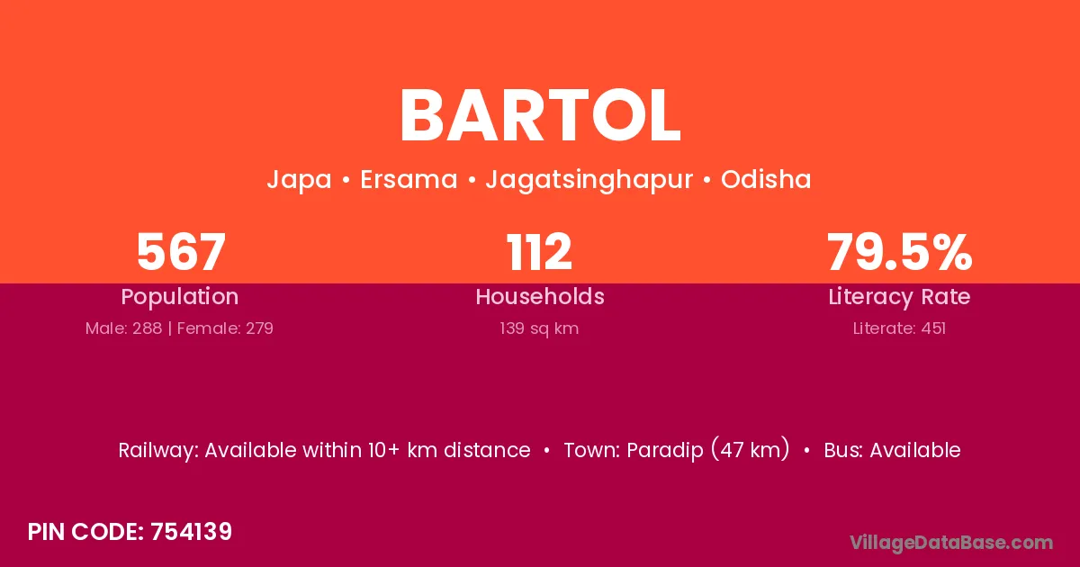 Paradip (47 km) is the nearest town to Bartol village for major economic activities and is located approximately 47 km away.