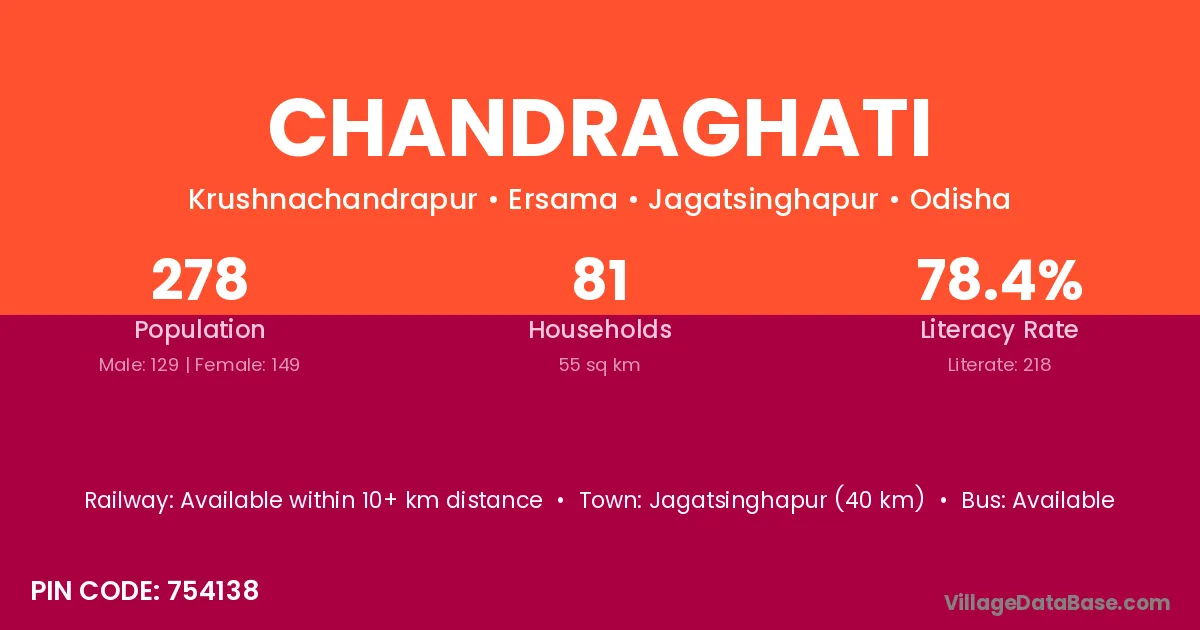 Jagatsinghapur (40 km) is the nearest town to Chandraghati village for major economic activities and is located approximately 40 km away.