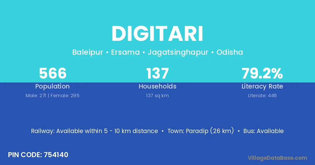 Paradip (26 km) is the nearest town to Digitari village for major economic activities and is located approximately 26 km away.