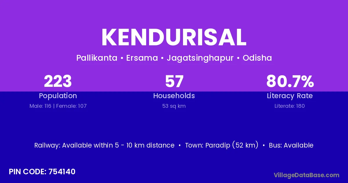 Paradip (52 km) is the nearest town to Kendurisal village for major economic activities and is located approximately 52 km away.