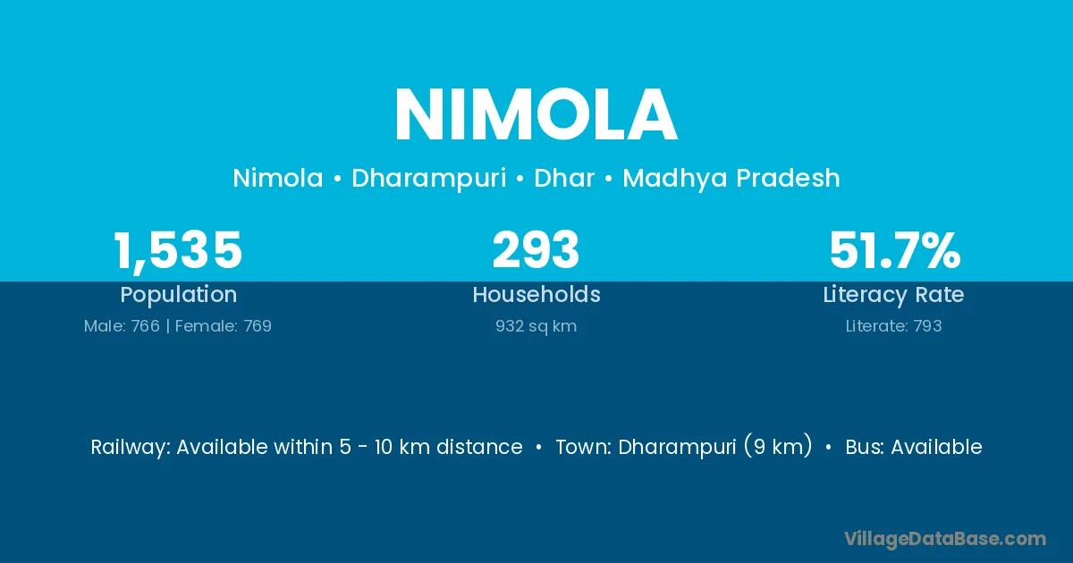 The literacy rate of Nimola village is 84.29%. Male literacy stands at 87.05% and female literacy at 81.70%.