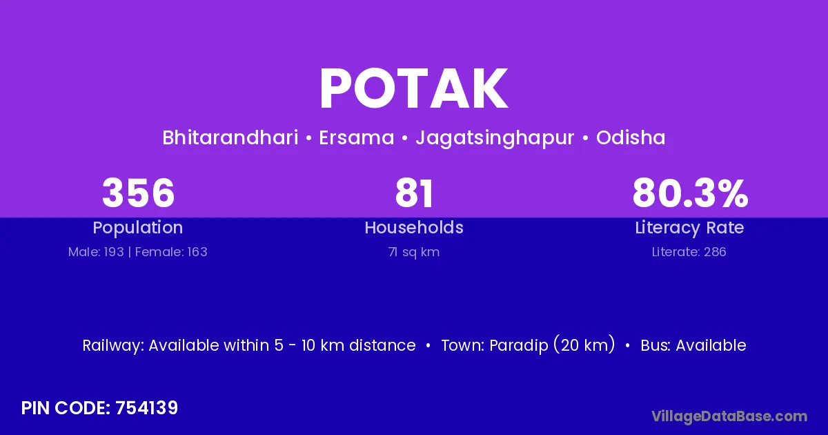Paradip (20 km) is the nearest town to Potak village for major economic activities and is located approximately 20 km away.