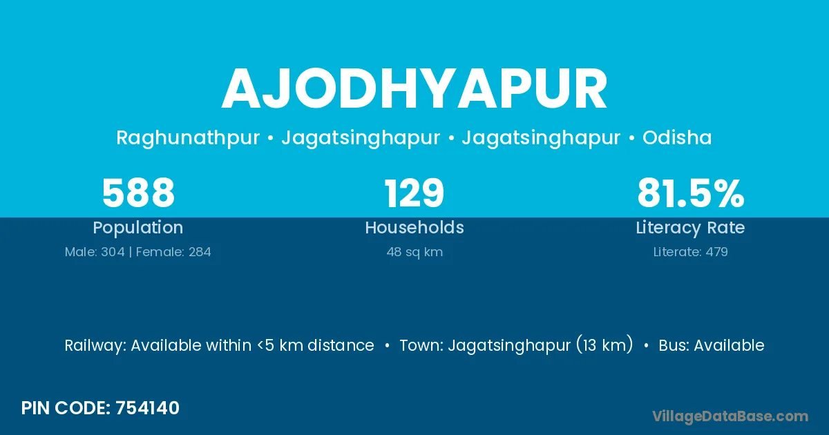 Jagatsinghapur (13 km) is the nearest town to Ajodhyapur village for major economic activities and is located approximately 13 km away.