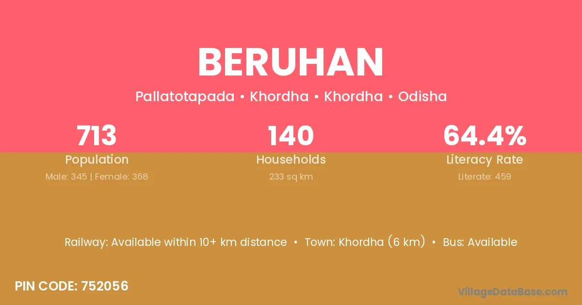 Jagatsinghapur (4 km) is the nearest town to Beruhan village for major economic activities and is located approximately 4 km away.