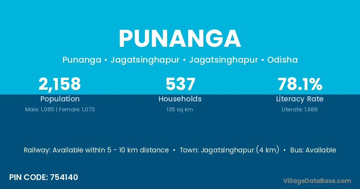 Jagatsinghapur (4 km) is the nearest town to Punanga village for major economic activities and is located approximately 4 km away.