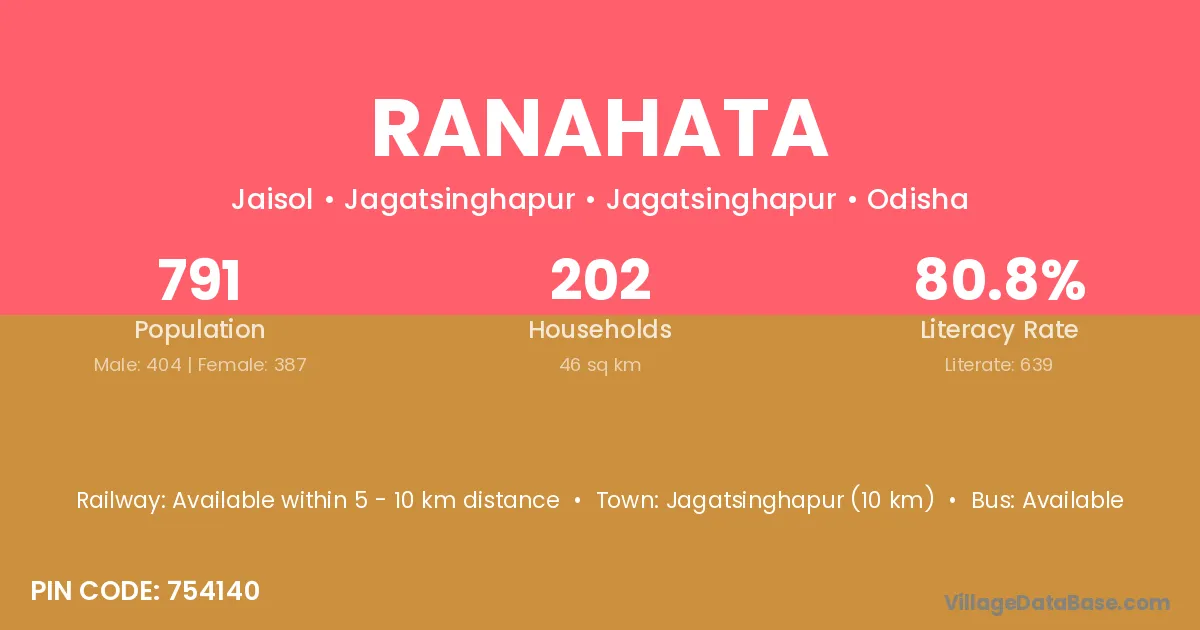 Jagatsinghapur (10 km) is the nearest town to Ranahata village for major economic activities and is located approximately 10 km away.