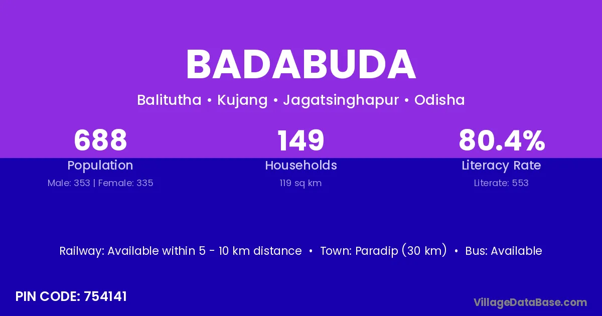 Paradip (30 km) is the nearest town to Badabuda village for major economic activities and is located approximately 30 km away.