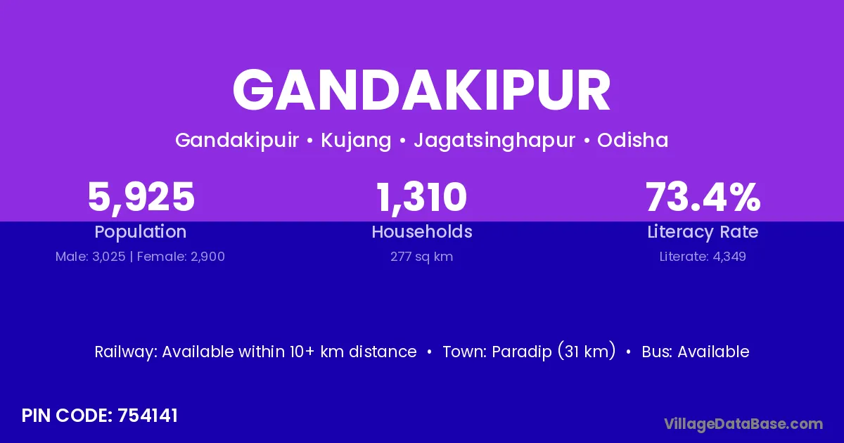 Paradip (31 km) is the nearest town to Gandakipur village for major economic activities and is located approximately 31 km away.
