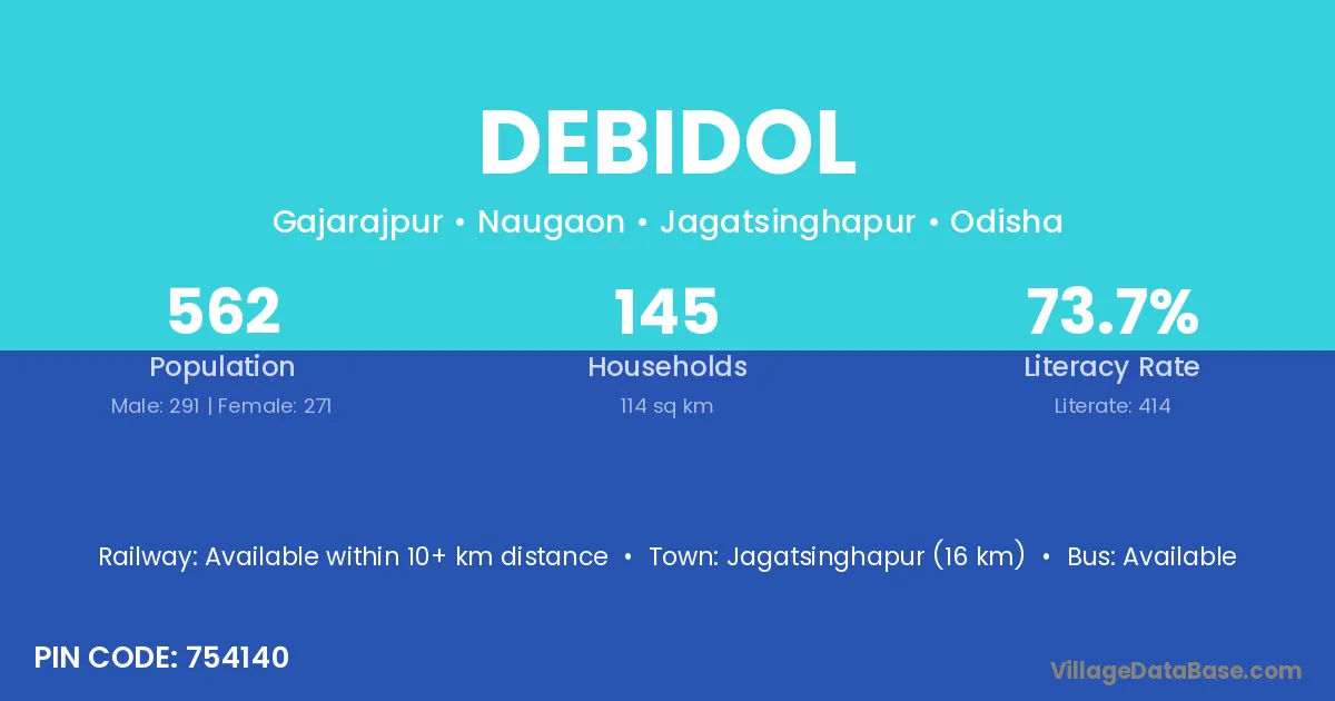 Jagatsinghapur (16 km) is the nearest town to Debidol village for major economic activities and is located approximately 16 km away.