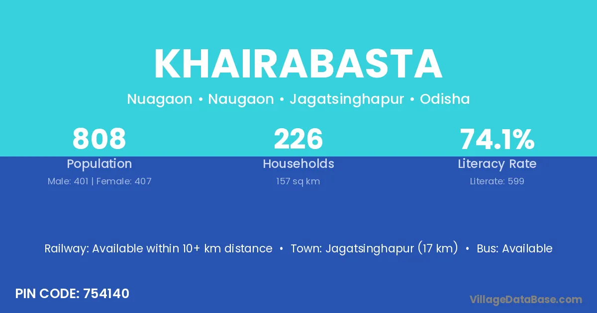Jagatsinghapur (17 km) is the nearest town to Khairabasta village for major economic activities and is located approximately 17 km away.