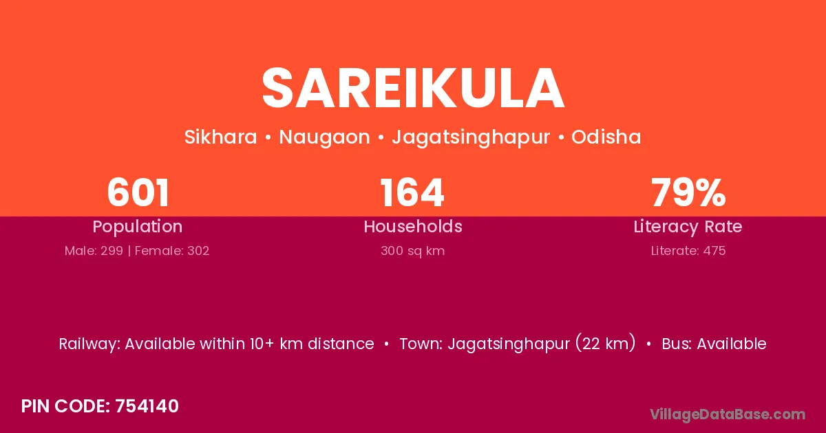 Jagatsinghapur (22 km) is the nearest town to Sareikula village for major economic activities and is located approximately 22 km away.